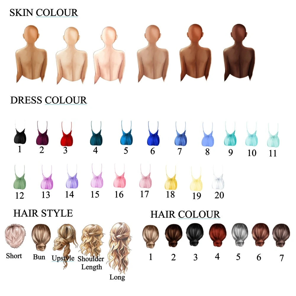 ✔ Personalized hair colours – Match the illustration to your bridal party’s real hair shades.