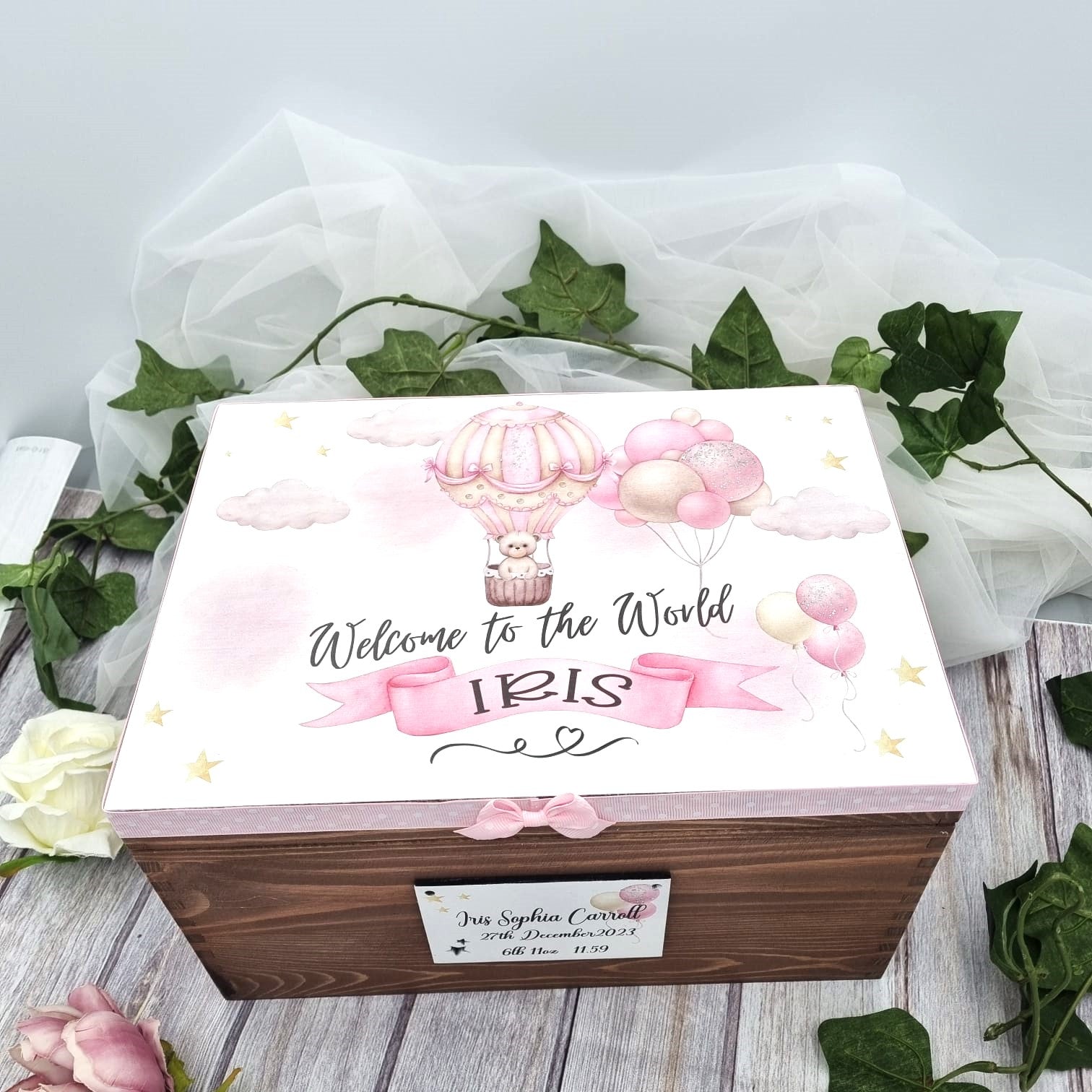 Each box is finished with a ribbon around the lid and hand made bow. Baby's details are added to the plaque at the front of the box.